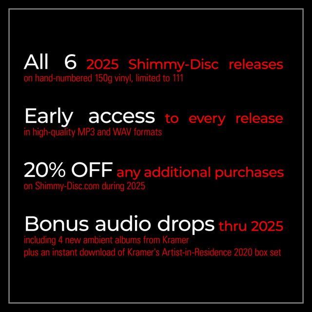 - 4 new and unreleased digital-only ambient albums from Kramer PLUS an instant download link for Kramer's 2020 Artist-in-Residence 5 LP Box Set - originally released by Joyful Noise Recordings. (Over 400 minutes of music! A $45 value!)