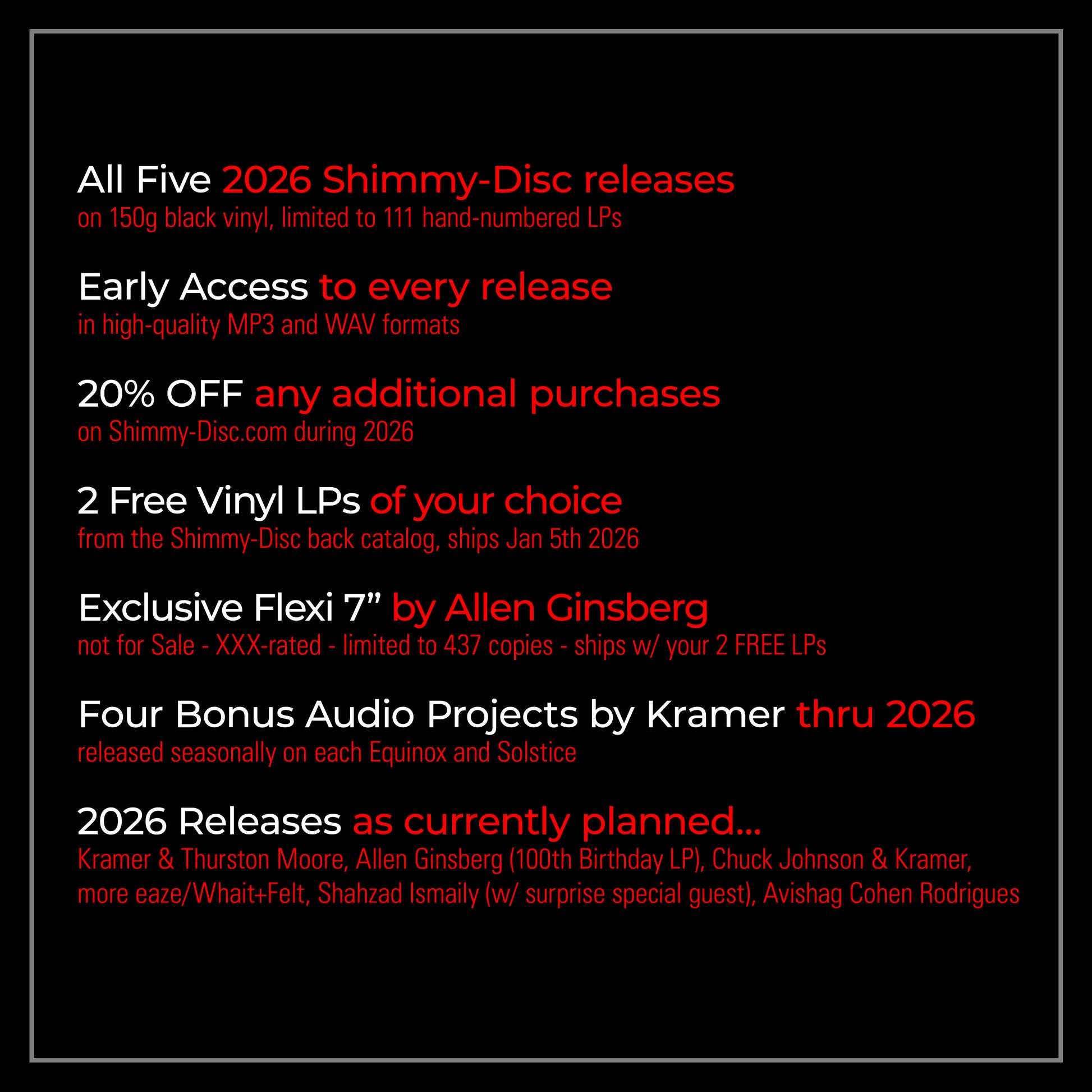 - 2 Free Vinyl LPs of your choice from the Shimmy-Disc back catalog